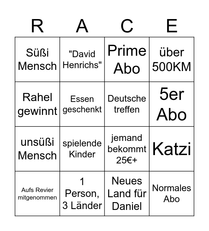 This bingo card has 16 words: 1 Person, 3 Länder, Katzi, Prime Abo, Süßi Mensch, unsüßi Mensch, "David Henrichs", jemand bekommt 25€+, Neues Land für Daniel, Rahel gewinnt, Essen geschenkt, Aufs Revier mitgenommen, über 500KM, spielende Kinder, 5er Abo, Deutsche treffen and Normales Abo.