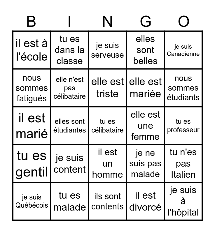 This bingo card has a free space and 24 words: je suis content, tu es malade, elle est triste, je suis Québécois, je suis Canadienne, il est à l'école, nous sommes fatigués, tu es dans la classe, elle est une femme, il est un homme, elle est mariée, il est marié, je ne suis pas malade, tu n'es pas Italien, elle n'est pas célibataire, il est divorcé, tu es professeur, je suis serveuse, nous sommes étudiants, elles sont étudiantes, je suis à l'hôpital, tu es gentil, elles sont belles and ils sont contents.