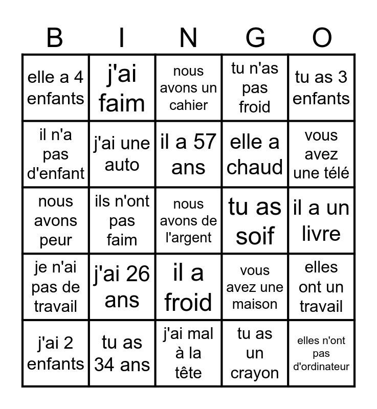 This bingo card has a free space and 24 words: j'ai 26 ans, tu as 34 ans, il a 57 ans, j'ai 2 enfants, tu as 3 enfants, elle a 4 enfants, il n'a pas d'enfant, j'ai faim, tu as soif, il a froid, elle a chaud, nous avons peur, vous avez une maison, elles ont un travail, j'ai une auto, tu as un crayon, il a un livre, nous avons un cahier, vous avez une télé, ils n'ont pas faim, elles n'ont pas d'ordinateur, je n'ai pas de travail, tu n'as pas froid and j'ai mal à la tête.
