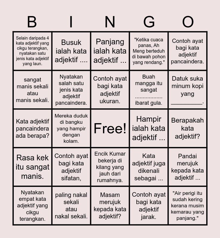 This bingo card has a free space and 24 words: Nyatakan empat kata adjektif yang cikgu terangkan., Contoh ayat bagi kata adjektif sifatan,, Contoh ayat bagi kata adjektif ukuran., Contoh ayat bagi kata adjektif jarak., Contoh ayat bagi kata adjektif pancaindera., Selain daripada 4 kata adjektif yang cikgu terangkan, nyatakan satu jenis kata adjektif yang laun., Busuk ialah kata adjektif ...., Panjang ialah kata adjektif ..., Hampir ialah kata adjektif ..., Berapakah kata adjektif?, Kata adjektif pancaindera ada berapa?, Nyatakan salah satu jenis kata adjektif pancaindera., Kata adjektif juga dikenali sebagai ..., Pandai merujuk kepada kata adjektif ..., sangat manis sekali atau manis sekali., paling nakal sekali atau nakal sekali., Masam merujuk kepada kata adjektif?, "Ketika cuaca panas, Ah Meng berteduh di bawah pohon yang rendang.", Datuk suka minum kopi yang _________., Rasa kek itu sangat manis., Mereka duduk di bangku yang hampir dengan kolam., Encik Kumar bekerja di kilang yang jauh dari rumahnya., Buah mangga itu sangat .................. ibarat gula. and "Air perigi itu sudah kering kerana musim kemarau yang panjang.".