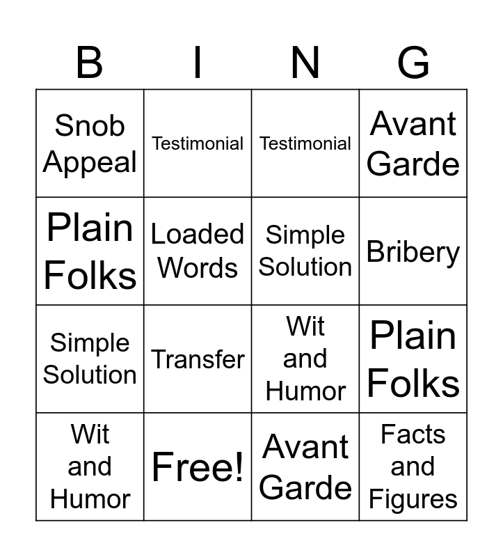 ⚠ This card has duplicate items: Facts and Figures (2), Bandwagon (2), Plain Folks (2), Magic Ingredient (2), Snob Appeal (2), Testimonial (2), Simple Solution (2), Loaded Words (2), Avant Garde (2), Wit and Humor (2), Patriotism (2), Bribery (2), Transfer (2)