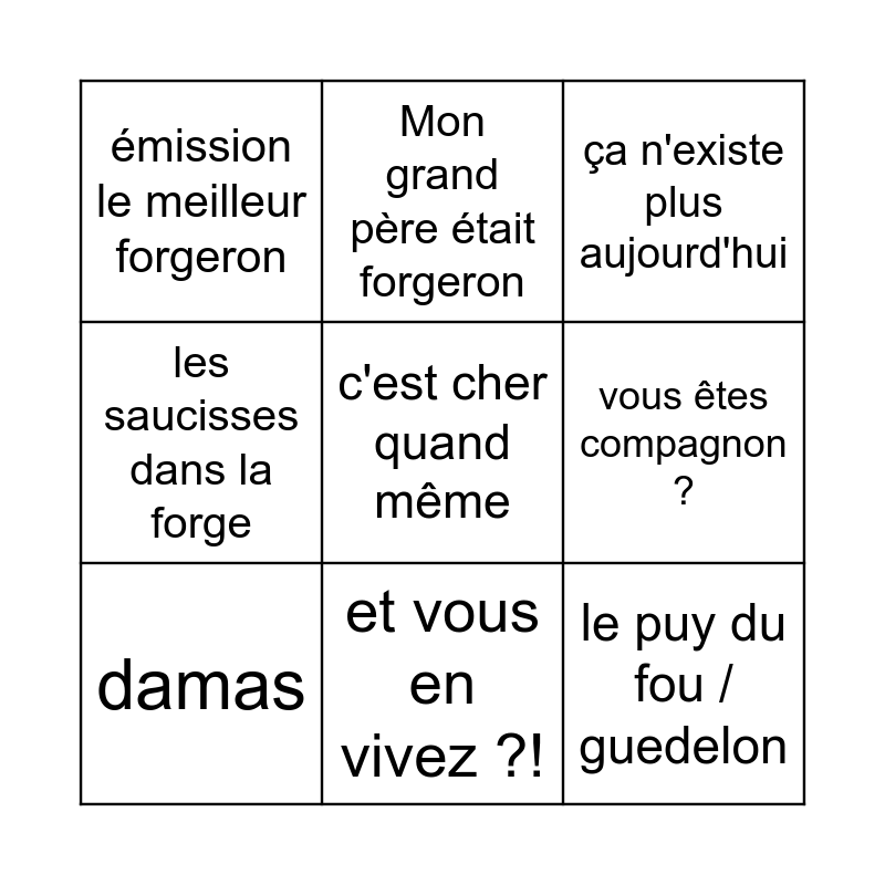 This bingo card has a free space and 8 words: vous êtes compagnon ?, ça n'existe plus aujourd'hui, Mon grand père était forgeron, damas, émission le meilleur forgeron, le puy du fou / guedelon, les saucisses dans la forge and et vous en vivez ?!.