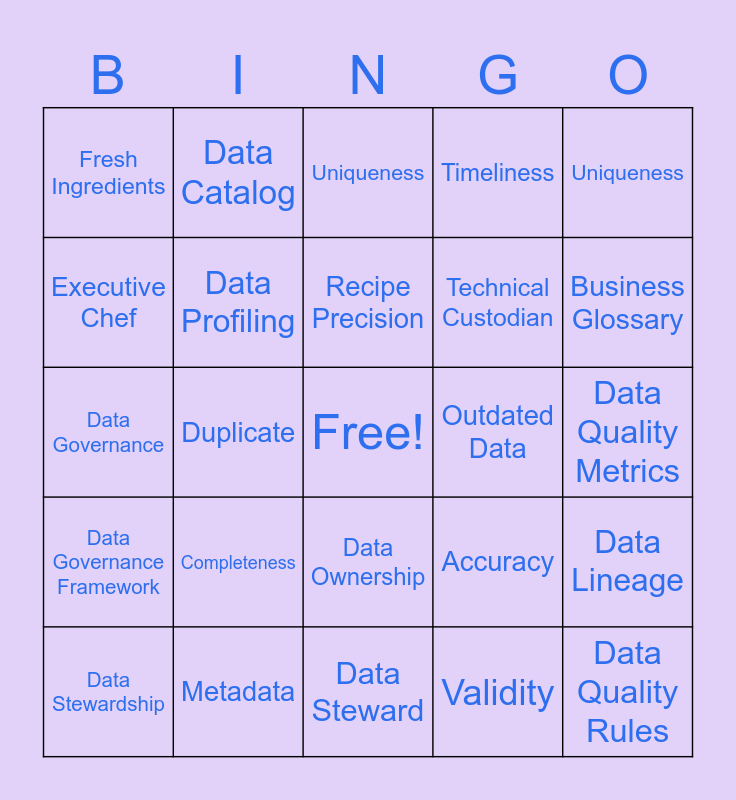 This bingo card has a free space and 24 words: Completeness, Metadata, Recipe Precision, Data Stewardship, Uniqueness, Fresh Ingredients, Executive Chef, Data Catalog, Outdated Data, Data Ownership, Technical Custodian, Data Governance, Accuracy, Data Lineage, Data Profiling, Validity, Data Quality Metrics, Uniqueness, Business Glossary, Duplicate, Data Quality Rules, Data Governance Framework, Timeliness and Data Steward.