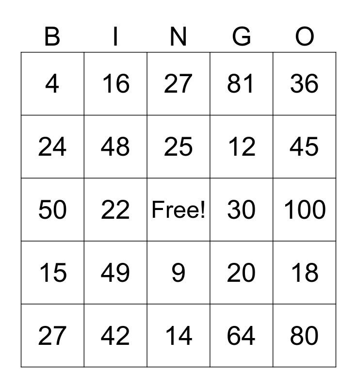 This bingo card has a free space and 24 words: 49, 42, 25, 27, 36, 4, 24, 16, 30, 9, 12, 50, 20, 18, 48, 64, 100, 27, 45, 22, 80, 15, 81 and 14.