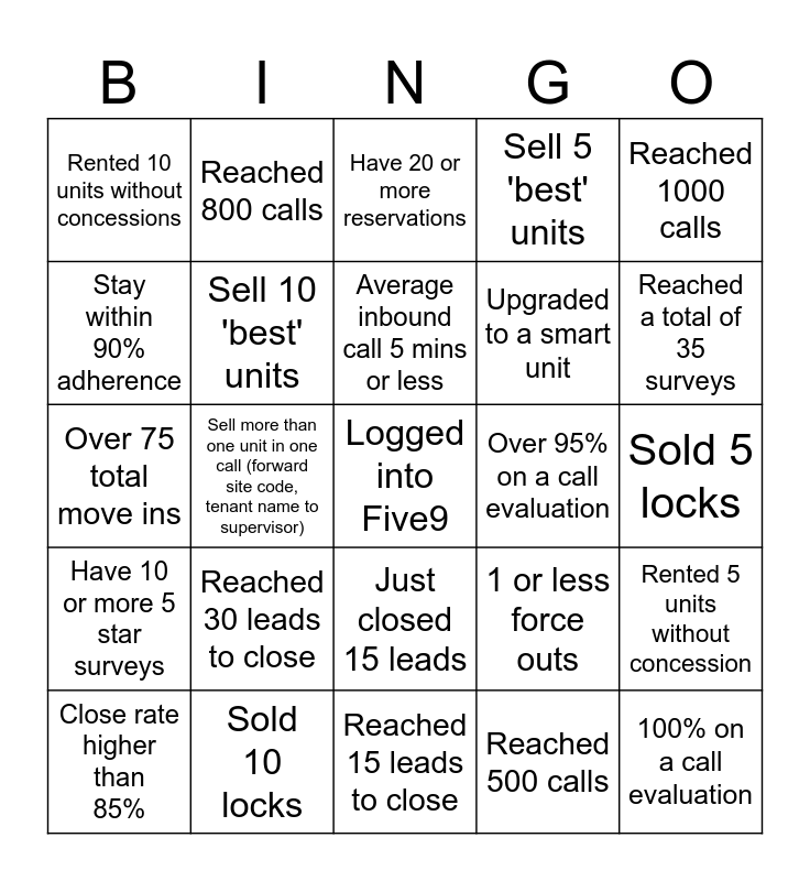 This bingo card has a free space and 24 words: Reached 30 leads to close, Sold 10 locks, Average inbound call 5 mins or less, Close rate higher than 85%, Reached 1000 calls, Rented 10 units without concessions, Stay within 90% adherence, Reached 800 calls, Over 95% on a call evaluation, Just closed 15 leads, Upgraded to a smart unit, Over 75 total move ins, 1 or less force outs, Rented 5 units without concession, Sell 10 'best' units, Reached 500 calls, Sold 5 locks, Have 20 or more reservations, Reached a total of 35 surveys, Sell more than one unit in one call (forward site code, tenant name to supervisor), 100% on a call evaluation, Have 10 or more 5 star surveys, Sell 5 'best' units and Reached 15 leads to close.