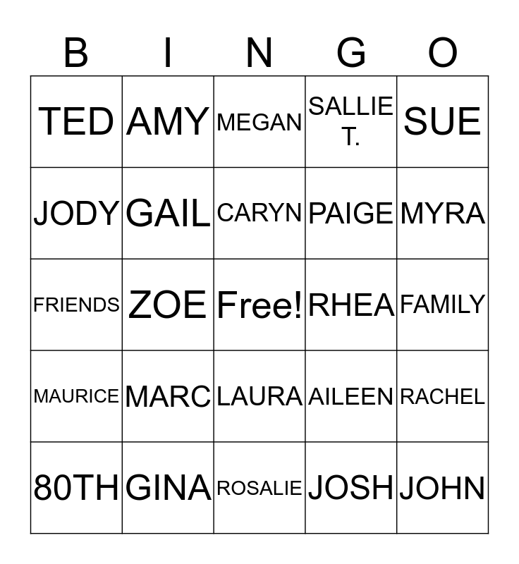 This bingo card has a free space and 24 words: MARC, GINA, CARYN, 80TH, SUE, TED, JODY, AMY, RHEA, LAURA, PAIGE, FRIENDS, AILEEN, RACHEL, GAIL, JOSH, FAMILY, MEGAN, MYRA, ZOE, JOHN, MAURICE, SALLIE T. and ROSALIE.