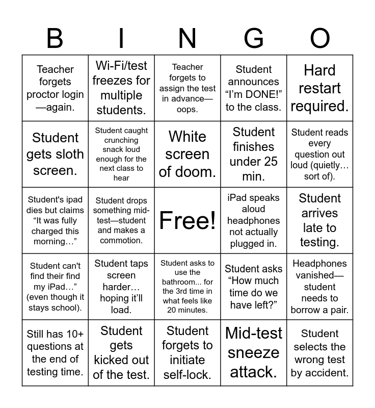 This bingo card has a free space and 26 words: Student asks to use the bathroom... for the 3rd time in what feels like 20 minutes., Mid-test sneeze attack., White screen of doom., Student gets kicked out of the test., Hard restart required., Teacher forgets proctor login—again., Student gets sloth screen., Wi-Fi/test freezes for multiple students., Student arrives late to testing., Student asks “How much time do we have left?”, Student finishes under 25 min., Student's ipad dies but claims “It was fully charged this morning…”, Headphones vanished—student needs to borrow a pair., Still has 10+ questions at the end of testing time., Student drops something mid-test—student and makes a commotion., Student tries to Log into TestNav instead of NWEA., Student announces “I’m DONE!” to the class., Student can't find their find my iPad…” (even though it stays school)., Teacher forgets to assign the test in advance—oops., Student selects the wrong test by accident., Student reads every question out loud (quietly… sort of)., Student forgets to initiate self-lock., iPad speaks aloud headphones not actually plugged in., Student taps screen harder… hoping it’ll load., Student caught crunching snack loud enough for the next class to hear and Student raises their hand before submitting the test.