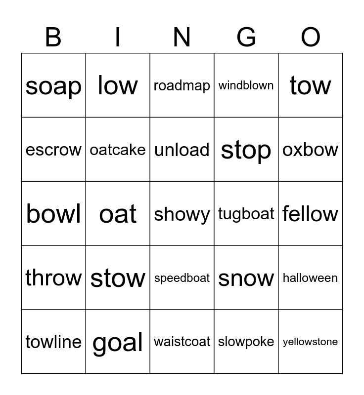 This bingo card has 30 words: goal, joan, oat, roam, soap, roadmap, oatcake, speedboat, tugboat, waistcoat, fellow, showy, slowpoke, yellowstone, oxbow, fishbowl, snow, throw, stow, tow, bowl, blown, low, stop, escrow, windblown, halloween, towline, unload and foamy.