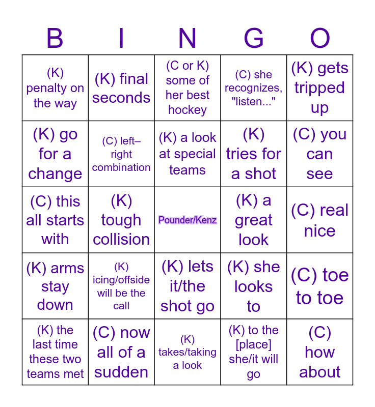 This bingo card has a free space and 24 words: (K) icing/offside will be the call, (C) now all of a sudden, (K) a look at special teams, (K) the last time these two teams met, (K) gets tripped up, (K) penalty on the way, (K) go for a change, (K) final seconds, (K) a great look, (K) lets it/the shot go, (K) tries for a shot, (C) this all starts with, (K) she looks to, (C) toe to toe, (C) left–right combination, (K) to the [place] she/it will go, (C) real nice, (C or K) some of her best hockey, (C) you can see, (K) tough collision, (C) how about, (K) arms stay down, (C) she recognizes, "listen..." and (K) takes/taking a look.