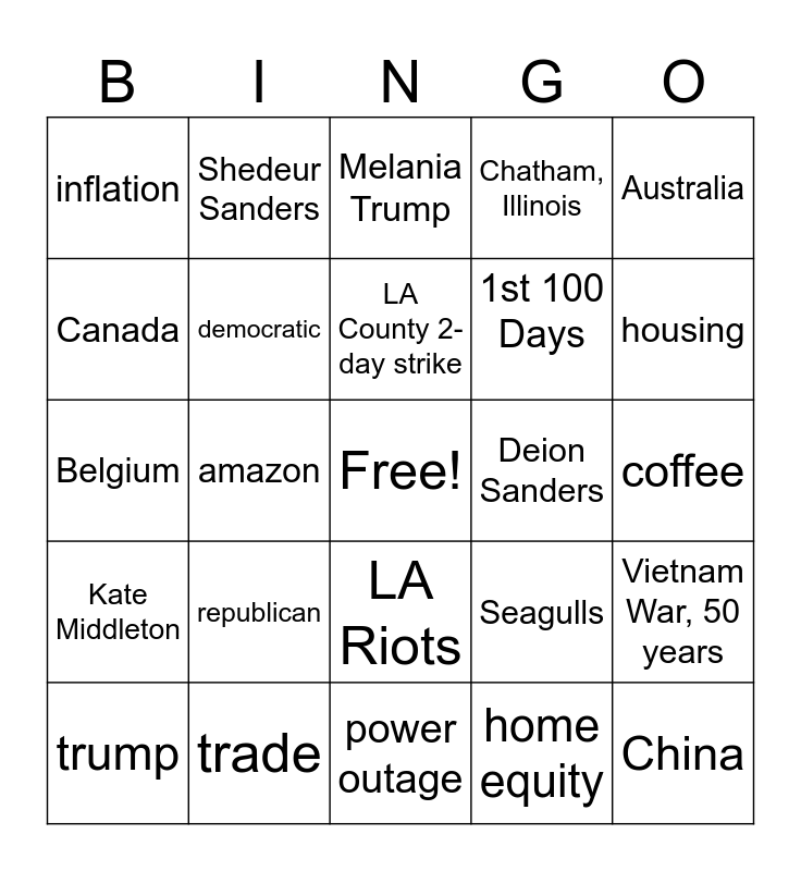 This bingo card has a free space and 29 words: trump, Media bias, amazon, tariffs, inflation, Melania Trump, democratic, republican, Deion Sanders, trade, coffee, China, power outage, home equity, housing, cost of living, LA Riots, Kate Middleton, Australia, Belgium, Seagulls, Jalen Hurts, 1st 100 Days, Canada, Chatham, Illinois, Shedeur Sanders, Vietnam War, 50 years, LA County 2-day strike and GM Stock.