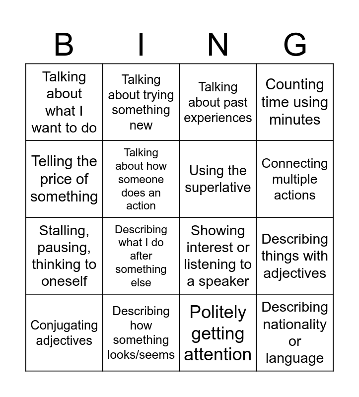 This bingo card has 16 words: Describing how something looks/seems, Describing things with adjectives, Talking about past experiences, Talking about what I want to do, Stalling, pausing, thinking to oneself, Talking about trying something new, Showing interest or listening to a speaker, Politely getting attention, Telling the price of something, Talking about how someone does an action, Conjugating adjectives, Counting time using minutes, Describing what I do after something else, Connecting multiple actions, Using the superlative and Describing nationality or language.
