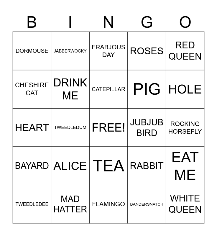 This bingo card has a free space and 24 words: ALICE, MAD HATTER, CATEPILLAR, TWEEDLEDEE, RED QUEEN, DORMOUSE, CHESHIRE CAT, JABBERWOCKY, JUBJUB BIRD, TEA, PIG, HEART, RABBIT, EAT ME, DRINK ME, BANDERSNATCH, ROCKING HORSEFLY, FRABJOUS DAY, HOLE, TWEEDLEDUM, WHITE QUEEN, BAYARD, ROSES and FLAMINGO.