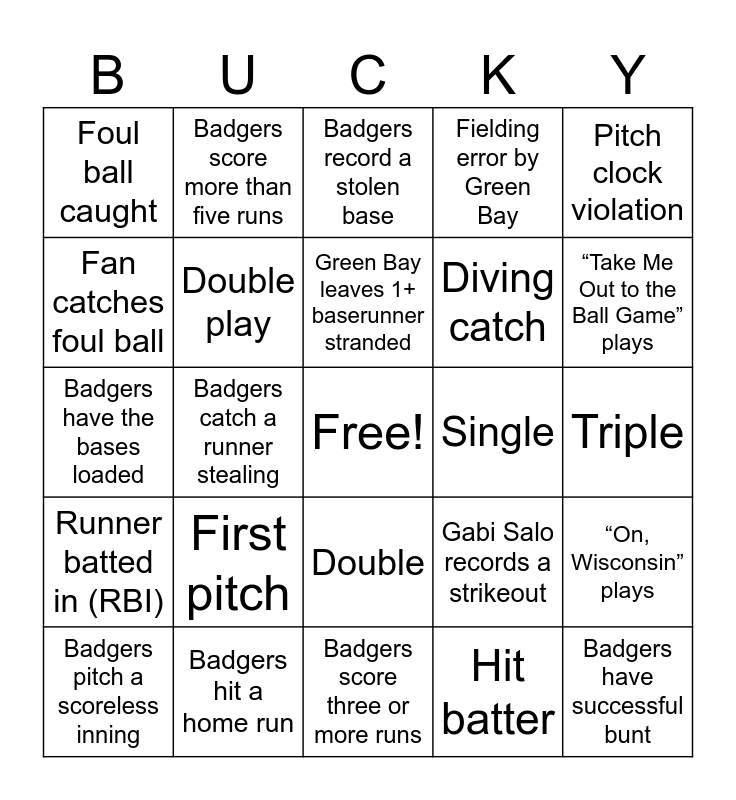 This bingo card has a free space and 30 words: Badgers hit a home run, Badgers strike out three or more batters, Badgers catch a runner stealing, A Badger walks, Foul ball caught, Badgers record a stolen base, Double play, Double, Single, Badgers score three or more runs, Triple, Badgers have successful bunt, Hit batter, Badgers attempt squeeze bunt, “Take Me Out to the Ball Game” plays, Hilary Blomberg hits a home run, Gabi Salo records a strikeout, Runner batted in (RBI), First pitch, Pitch clock violation, Badgers have the bases loaded, You see Bucky Badger, Badgers score more than five runs, Diving catch, Fan catches foul ball, Fielding error by Green Bay, “On, Wisconsin” plays, Badgers pitch a scoreless inning, Green Bay leaves 1+ baserunner stranded and Molly Schlosser gets a hit.