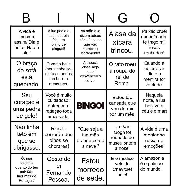 This bingo card has a free space and 24 words: Ó, mar salgado, quanto do teu sal/ São lágrimas de Portugal?, Rios te correrão dos olhos se chorares!, A raposa disse algo que convenceu o corvo., E o médico veio de Chevrolet hoje!, Paixão cruel desenfreada, te trago mil rosas roubadas!, A vida é mesmo assim/ Dia e noite, Não e sim!, A lua pedia a cada estrela fria, um brilho de aluguel!, As mão que dizem adeus são pássaros que vão morrendo lentamente!, Estou tão cansada que vou dormir por um mês., Naquela noite, a lua beijava o céu e o mar!, Seu coração é uma pedra de gelo!, O vento beija meus cabelos, sinto as ondas lamberem meus pés., Um Van Gogh foi roubado do museu ontem a noite!, A vida é uma montanha russa de emoções!, O braço do sofá está quebrado., Gosto de ler Fernando Pessoa., Estou morredo de sede., A asa da xícara trincou., Quando a noite virar dia e a mentira for verdade., Não tinha teto em que se abrigasse., Você é muito cuidadoso: entregou a redação toda amassada., "Que seja a tua mão branda como a neve.", O rato roeu a roupa do rei de Roma. and A amazônia é o pulmão do mundo..