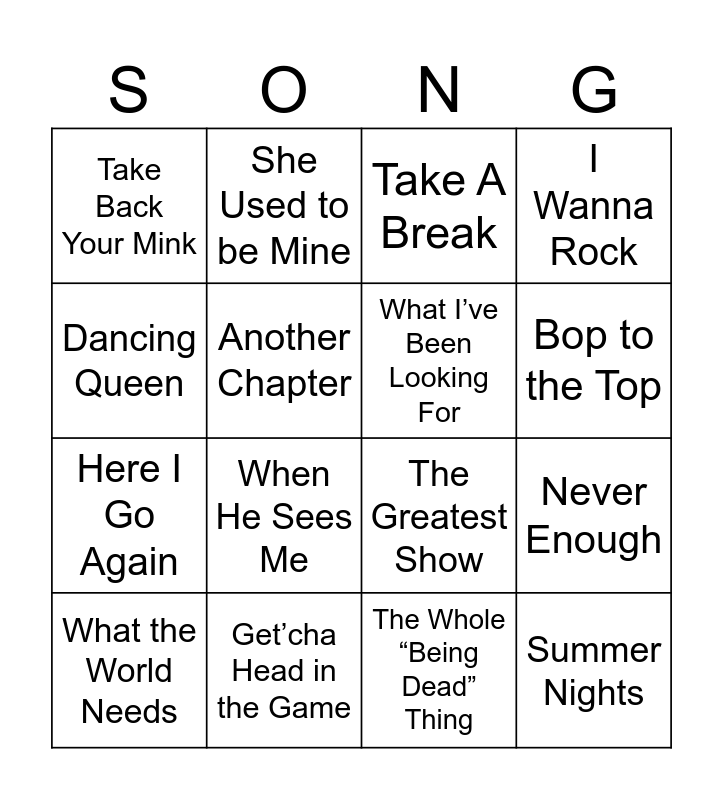 This bingo card has 32 words: Lay All Your Love On Me, Seasons of Love, Never Enough, Waving Through A Window, Summer Nights, What I’ve Been Looking For, Dancing Queen, Popular, She Used to be Mine, You Can’t Stop The Beat, Bop to the Top, Take A Break, Burn, Say My Name, Get’cha Head in the Game, Breaking Free, Defying Gravity, The Greatest Show, Memory, Think of Me, I Know it’s Today, Freak Flag, The Whole “Being Dead” Thing, The Ballad of Jane Doe, What the World Needs, I Wanna Rock, Here I Go Again, Another Chapter, Take Back Your Mink, Sit Down, You’re Rockin’ The Boat, I’m Not Through and When He Sees Me.