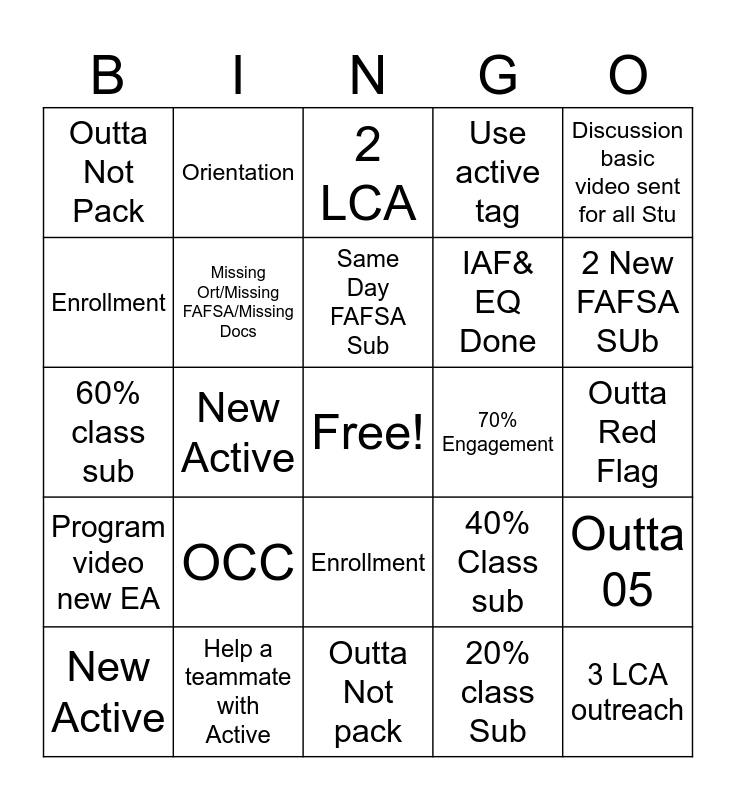 This bingo card has a free space and 24 words: OCC, Help a teammate with Active, Same Day FAFSA Sub, New Active, Discussion basic video sent for all Stu, Outta Not Pack, Enrollment, Orientation, 70% Engagement, Enrollment, IAF& EQ Done, 60% class sub, 40% Class sub, Outta 05, Missing Ort/Missing FAFSA/Missing Docs, 20% class Sub, Outta Red Flag, 2 LCA, 2 New FAFSA SUb, New Active, 3 LCA outreach, Program video new EA, Use active tag and Outta Not pack.