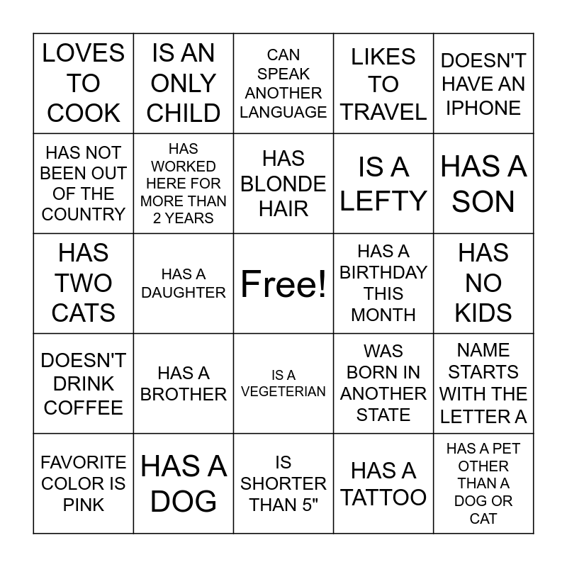 This bingo card has a free space and 24 words: HAS A BROTHER, HAS A DOG, HAS BLONDE HAIR, FAVORITE COLOR IS PINK, DOESN'T HAVE AN IPHONE, LOVES TO COOK, HAS NOT BEEN OUT OF THE COUNTRY, IS AN ONLY CHILD, HAS A BIRTHDAY THIS MONTH, IS A VEGETERIAN, IS A LEFTY, HAS TWO CATS, WAS BORN IN ANOTHER STATE, NAME STARTS WITH THE LETTER A, HAS WORKED HERE FOR MORE THAN 2 YEARS, HAS A TATTOO, HAS NO KIDS, CAN SPEAK ANOTHER LANGUAGE, HAS A SON, HAS A DAUGHTER, HAS A PET OTHER THAN A DOG OR CAT, DOESN'T DRINK COFFEE, LIKES TO TRAVEL and IS SHORTER THAN 5".
