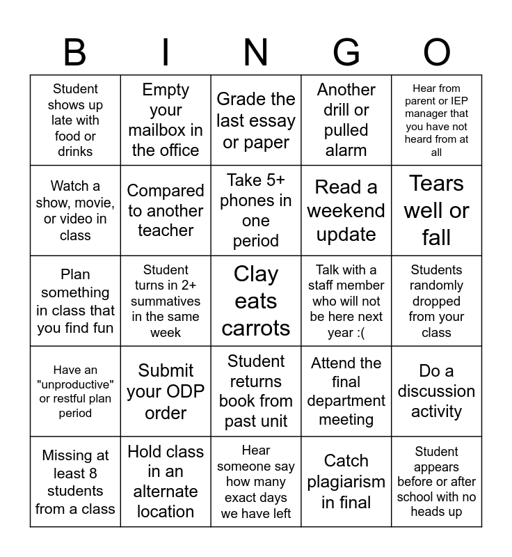 This bingo card has a free space and 27 words: Attend the final department meeting, Have a student ask to get their grade up at the last second, Read a weekend update, Hear someone say how many exact days we have left, Watch a show, movie, or video in class, Grade the last essay or paper, Empty your mailbox in the office, Have an "unproductive" or restful plan period, Talk with a staff member who will not be here next year :(, Do a discussion activity, Plan something in class that you find fun, Another drill or pulled alarm, Missing at least 8 students from a class, Hold class in an alternate location, Tears well or fall, Last minute email from counselor, Compared to another teacher, Take 5+ phones in one period, Submit your ODP order, Student shows up late with food or drinks, Students randomly dropped from your class, Catch plagiarism in final, Student turns in 2+ summatives in the same week, Student appears before or after school with no heads up, Student returns book from past unit, Hear from parent or IEP manager that you have not heard from at all and Student thanks you for the semester.