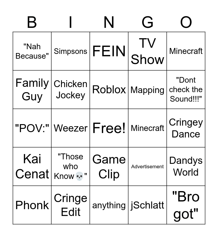 This bingo card has a free space and 24 words: "Those who Know💀", Cringe Edit, Roblox, Phonk, Minecraft, "Nah Because", Family Guy, Simpsons, Minecraft, Game Clip, Mapping, "POV:", Advertisement, Dandys World, Chicken Jockey, jSchlatt, Cringey Dance, FEIN, "Dont check the Sound!!!", Weezer, "Bro got", Kai Cenat, TV Show and anything.