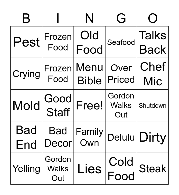 This bingo card has a free space and 24 words: Bad Decor, Gordon Walks Out, Menu Bible, Yelling, Talks Back, Pest, Crying, Frozen Food, Gordon Walks Out, Family Own, Over Priced, Mold, Delulu, Dirty, Frozen Food, Cold Food, Shutdown, Old Food, Chef Mic, Good Staff, Steak, Bad End, Seafood and Lies.