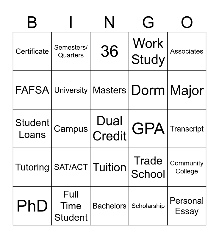 This bingo card has 25 words: SAT/ACT, Bachelors, Masters, PhD, Associates, Certificate, FAFSA, Semesters/ Quarters, GPA, Tuition, Dorm, Student Loans, Trade School, Community College, University, Personal Essay, Transcript, 36, Major, Campus, Dual Credit, Full Time Student, Tutoring, Work Study and Scholarship.