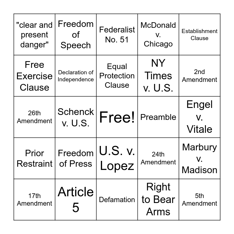 This bingo card has a free space and 67 words: McCulloch v. Maryland, Supremacy Clause, Necessary and Proper Clause, Marbury v. Madison, Writ of Mandamus, Citizens United v. FEC, Freedom of Speech, Shaw v. Reno, Equal Protection Clause, Baker v. Carr, U.S. v. Lopez, Commerce Clause, Engel v. Vitale, Establishment Clause, Wisconsin v. Yoder, Free Exercise Clause, Schenck v. U.S., "clear and present danger", Tinker v. Des Moines, NY Times v. U.S., Freedom of Press, Prior Restraint, McDonald v. Chicago, Right to Bear Arms, Gideon v. Wainwright, Right to an attorney, Brown v. Board of Education, 1st Amendment, 2nd Amendment, 4th Amendment, 5th Amendment, 6th Amendment, 8th Amendment, 14th Amendment, 15th Amendment, 17th Amendment, 19th Amendment, 24th Amendment, 26th Amendment, 22nd Amendment, Articles of Confederation, Declaration of Independence, Preamble, Article 1, Article 2, Article 3, Article 4, Article 5, Article 6, Federalist No. 10, Federalist No. 51, Brutus 1, Federalist No. 70, Federalist No. 78, Letter from a Birmingham Jail, Defamation, Time, Place and Manner, Selective Incorporation, Due Process, Miranda Rights, Exclusionary Rule, Affirmative Action, Civil Rights Act of 1964, Title IX, Americans with Disabilities Act, Voting Rights Act of 1965 and Plessy v. Ferguson.