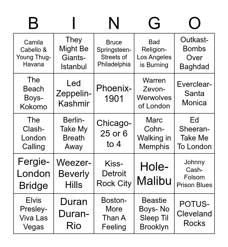 This bingo card has 29 words: Elvis Presley- Viva Las Vegas, N.W.A.- Straight Outta Compton, Berlin- Take My Breath Away, POTUS- Cleveland Rocks, Camila Cabello & Young Thug- Havana, Bruce Springsteen- Streets of Philadelphia, Led Zeppelin- Kashmir, Weezer- Beverly Hills, Marc Cohn- Walking in Memphis, Duran Duran- Rio, Ed Sheeran- Take Me To London, Chicago- 25 or 6 to 4, Boston- More Than A Feeling, Beastie Boys- No Sleep Til Brooklyn, Everclear- Santa Monica, Randy Newman- I Love L.A., Kiss- Detroit Rock City, Fergie- London Bridge, Outkast- Bombs Over Baghdad, The Clash- London Calling, Hole- Malibu, The Doors- LA Woman, Warren Zevon- Werwolves of London, The Beach Boys- Kokomo, Bad Religion- Los Angeles is Burning, They Might Be Giants- Istanbul, Johnny Cash- Folsom Prison Blues, Phoenix- 1901 and Florence + the Machine- Dog Days.