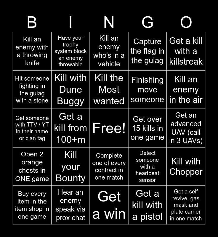 This bingo card has a free space and 37 words: Kill with ATV, Kill with Cargo Truck, Kill with LTV, Kill with Dune Buggy, Kill with Chopper, Kill your Bounty, Kill the Most wanted, Get a kill whilst being the most wanted, Get a kill with a killstreak, Get a melee kill, Get a kill from 100+m, Capture the flag in the gulag, Get a self revive, gas mask and plate carrier in one match, Get an advanced UAV (call in 3 UAVs), Hit someone fighting in the gulag with a stone, Open 2 orange chests in ONE game, Survive a most wanted contract, Kill an enemy who's in a vehicle, Complete one of every contract in one match, Get over 15 kills in one game, Kill an enemy with a throwing knife, Kill an enemy in the air, Buy every item in the item shop in one game, Get a win, Get a kill while in the gas, Get a kill with a pistol, Have your trophy system block an enemy throwable, Kill an enemy on a rope/elevator, Get 2 kills without reloading, Ping 4 different people with one recon drone, Kill an enemy with a spring mine, Hear an enemy speak via prox chat, Get someone with TTV / YT in their name or clan tag, Succesfull self revive, Detect someone with a heartbeat sensor, Finishing move someone and Revive a teammate (No buy back).