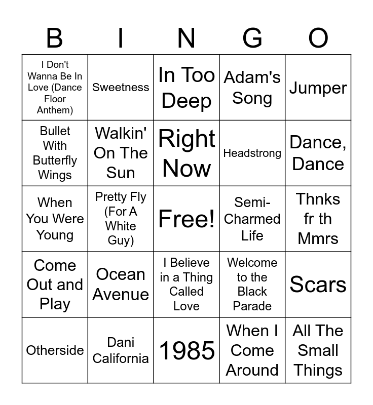 This bingo card has a free space and 44 words: Absolutely (Story of a Girl), All The Small Things, Then The Morning Comes, Otherside, The Middle, When I Come Around, In Too Deep, The Anthem, Jumper, Dani California, Adam's Song, Semi-Charmed Life, I Believe in a Thing Called Love, Ocean Avenue, Lifestyles of the Rich & Famous, 1985, One Week, When You Were Young, Somebody Told Me, Dance, Dance, Sweetness, By the Way, Mr. Brightside, I Don't Wanna Be In Love (Dance Floor Anthem), Smooth Criminal, Thnks fr th Mmrs, Kryptonite, The Pretender, Welcome to the Black Parade, Come Out and Play, Island In The Sun, Scars, Here It Goes Again, Wish You Were Here, Pretty Fly (For A White Guy), Paralyzer, Can't Stop, Blurry, Right Now, Bullet With Butterfly Wings, Headstrong, Lump, Walkin' On The Sun and Snow (Hey Oh).