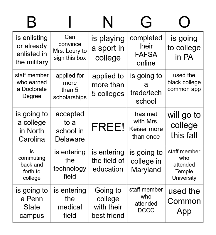 This bingo card has a free space and 24 words: is entering the technology field, is entering the medical field, applied to more than 5 colleges, is going to a Penn State campus, is going to college in PA, is enlisting or already enlisted in the military, staff member who earned a Doctorate Degree, Can convince Mrs. Loury to sign this box, has met with Mrs. Keiser more than once, is entering the field of education, is going to a trade/tech school, is going to a college in North Carolina, is going to college in Maryland, staff member who attended Temple University, applied for more than 5 scholarships, staff member who attended DCCC, will go to college this fall, is playing a sport in college, used the black college common app, accepted to a school in Delaware, used the Common App, is commuting back and forth to college, completed their FAFSA online and Going to college with their best friend.
