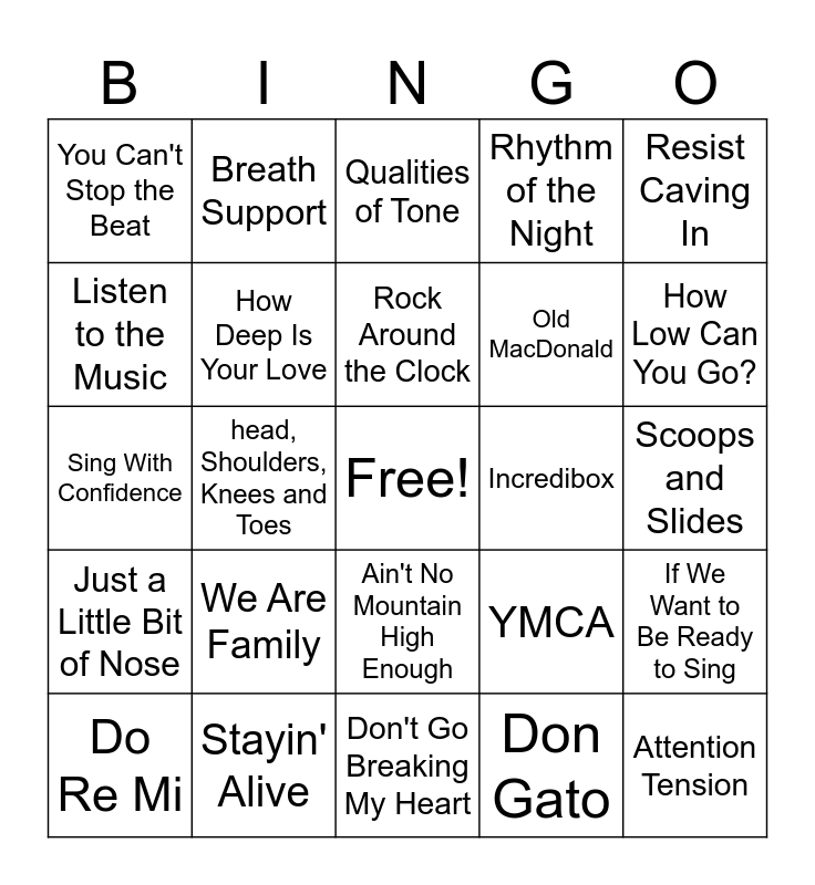 This bingo card has a free space and 24 words: We Are Family, Stayin' Alive, Rock Around the Clock, Do Re Mi, Resist Caving In, You Can't Stop the Beat, Listen to the Music, Breath Support, Incredibox, Ain't No Mountain High Enough, Old MacDonald, Sing With Confidence, YMCA, If We Want to Be Ready to Sing, How Deep Is Your Love, Don Gato, Scoops and Slides, Qualities of Tone, How Low Can You Go?, head, Shoulders, Knees and Toes, Attention Tension, Just a Little Bit of Nose, Rhythm of the Night and Don't Go Breaking My Heart.