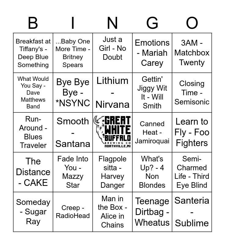 This bingo card has a free space and 55 words: Basket Case - Green Day, Someday - Sugar Ray, Linger - The Cranberries, Breakfast at Tiffany's - Deep Blue Something, Man in the Box - Alice in Chains, Bullet With Butterfly Wings - The Smashing Pumpkins, Bye Bye Bye - *NSYNC, I Want It That Way - Backstreet Boys, Gettin' Jiggy Wit It - Will Smith, Two Princes - Spin Doctors, Emotions - Mariah Carey, Can I Kick It? - A Tribe Called Quest, It Wasn't Me - Shaggy, Mr. Jones - Counting Crows, Even Flow - Pearl Jam, Enter Sandman - Metallica, 3AM - Matchbox Twenty, Smooth - Santana, Layla (Acoustic Live) - Eric Clapton, Santeria - Sublime, Canned Heat - Jamiroquai, The King Of Wishful Thinking - Go West, What's Up? - 4 Non Blondes, Just a Girl - No Doubt, Shoop - Salt-N-Pepa, Lithium - Nirvana, Teenage Dirtbag - Wheatus, My Own Worst Enemy - Lit, Learn to Fly - Foo Fighters, Semi-Charmed Life - Third Eye Blind, Iris - The Goo Goo Dolls, Believe - Cher, No Rain - Blind Melon, You Get What You Give - New Radicals, What Would You Say - Dave Matthews Band, Run- Around - Blues Traveler, Fell On Black Days - Soundgarden, The Distance - CAKE, Hold On - Wilson Phillips, U Can't Touch This - MC Hammer, ...Baby One More Time - Britney Spears, Friday I'm In Love - The Cure, Kiss Me - Sixpence Non The Richer, Celebrity Skin - Hole, Fade Into You - Mazzy Star, Creep - RadioHead, All the Small Things - blink-182, Walkin' On the Sun - Smash Mouth, Otherside - Red Hot Chilli Peppers, Closing Time - Semisonic, Gangsta's Paradise - Coolio, One Week - Barenaked Laides, Time, Love, and Tenderness - Michael Bolton, Flagpole sitta - Harvey Danger and Sabotage - Beastie Boys.