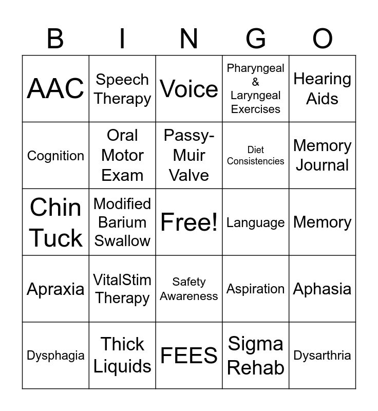 This bingo card has a free space and 24 words: VitalStim Therapy, Thick Liquids, Passy-Muir Valve, Dysphagia, Hearing Aids, AAC, Cognition, Speech Therapy, Language, Safety Awareness, Diet Consistencies, Chin Tuck, Aspiration, Aphasia, Oral Motor Exam, Sigma Rehab, Memory, Voice, Memory Journal, Modified Barium Swallow, Dysarthria, Apraxia, Pharyngeal & Laryngeal Exercises and FEES.