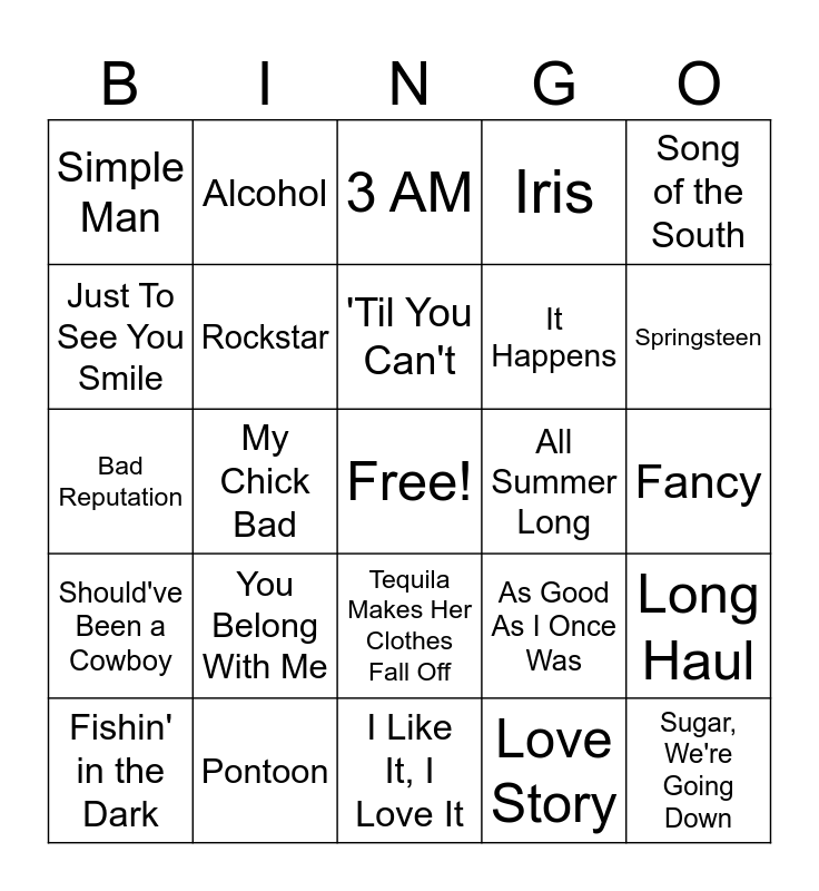 This bingo card has a free space and 73 words: The Race Is ON, Free Bird, Simple Man, Breathe, Genie in a Bottle, Courtesy of the Red, White, & Blue, Should've Been a Cowboy, Neon Moon, As Good As I Once Was, She Thinks My Tractor's Sexy, All Star, Chattahoochee, Rockstar, Fancy, Somebody Like You, Alcohol, I Like It, I Love It, Just To See You Smile, Hot In Herre, All Summer Long, 'Til You Can't, Iris, Song of the South, Dixieland Delight, Fishin' in the Dark, Life is a Highway, Say It Ain't So, Always On My Mind, Killin' Time, Mama He's Crazy, Pontoon, Boondocks, Fergalicious, Glamorous, My Chick Bad, Make Me Wanna, Good Directions, Rock and Roll All Nite, Sugar, We're Going Down, Dance, Dance, Love Story, You Belong With Me, It's Not Over, Ring of Fire, All I Want To Do, It Happens, 3 AM, Good Vibrations, Kokomo, Bad Reputation, I Want You to Want Me, Surrender, Hello Darlin', The Gambler, Gunpowder & Lead, She's Country, Fly Over State, Tequila Makes Her Clothes Fall Off, Redneck Woman, Before He Cheats, Save a Horse, Somewhere On A Beach, Pour Some Sugar on Me, Springsteen, Need a Favor, Fall In Love, Country Girl (Shake It For Me), That's My Kind of Night, Long Haul, Out of Oklahoma, Crank That, Kiss Me Thru The Phone and See You Tonight.
