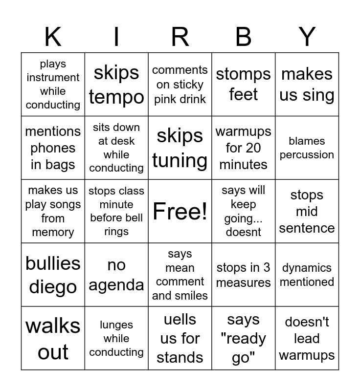 This bingo card has a free space and 24 words: no agenda, lunges while conducting, skips tuning, walks out, makes us sing, plays instrument while conducting, mentions phones in bags, skips tempo, says will keep going... doesnt, says mean comment and smiles, warmups for 20 minutes, makes us play songs from memory, stops in 3 measures, dynamics mentioned, sits down at desk while conducting, says "ready go", stops mid sentence, comments on sticky pink drink, blames percussion, stops class minute before bell rings, doesn't lead warmups, bullies diego, stomps feet and uells us for stands.