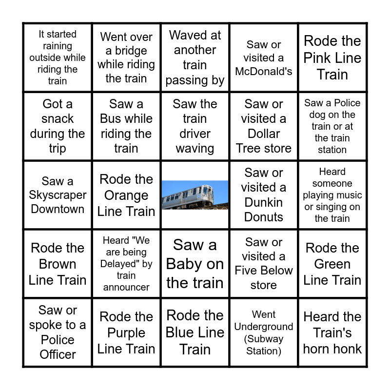 This bingo card has a free space and 24 words: Heard "We are being Delayed" by train announcer, Rode the Purple Line Train, Saw the train driver waving, Saw or spoke to a Police Officer, Rode the Pink Line Train, It started raining outside while riding the train, Got a snack during the trip, Went over a bridge while riding the train, Saw or visited a Dunkin Donuts, Saw a Baby on the train, Saw or visited a Dollar Tree store, Saw a Skyscraper Downtown, Saw or visited a Five Below store, Rode the Green Line Train, Saw a Bus while riding the train, Went Underground (Subway Station), Heard someone playing music or singing on the train, Waved at another train passing by, Saw a Police dog on the train or at the train station, Rode the Orange Line Train, Heard the Train's horn honk, Rode the Brown Line Train, Saw or visited a McDonald's and Rode the Blue Line Train.