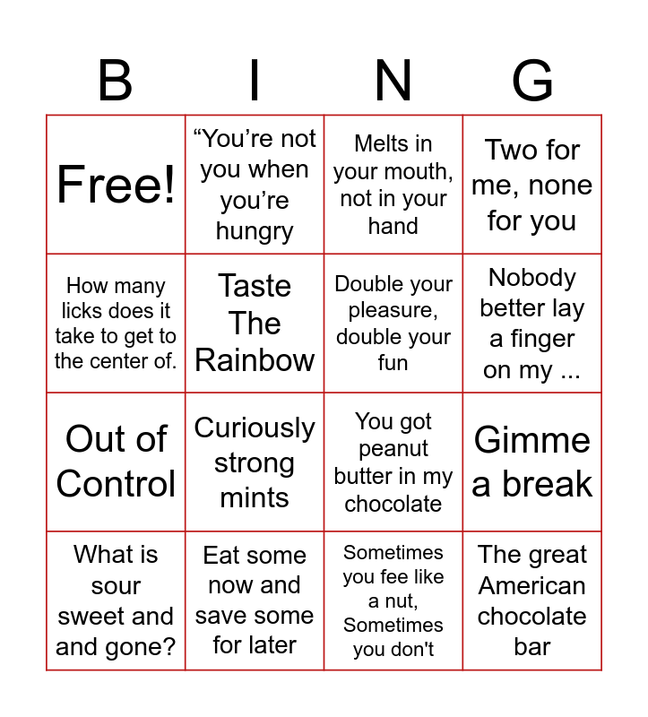 This bingo card has 16 words: What is sour sweet and and gone?, Eat some now and save some for later, Melts in your mouth, not in your hand, Two for me, none for you, How many licks does it take to get to the center of., “You’re not you when you’re hungry, You got peanut butter in my chocolate, Gimme a break, Free!, Taste The Rainbow, Sometimes you fee like a nut, Sometimes you don't, Nobody better lay a finger on my ..., Out of Control, Curiously strong mints, Double your pleasure, double your fun and The great American chocolate bar.