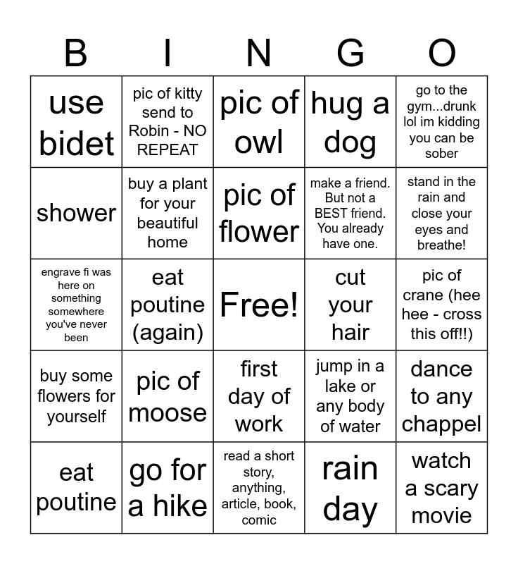 This bingo card has a free space and 24 words: pic of moose, go for a hike, pic of flower, eat poutine, go to the gym...drunk lol im kidding you can be sober, use bidet, shower, pic of kitty send to Robin - NO REPEAT, cut your hair, first day of work, make a friend. But not a BEST friend. You already have one., engrave fi was here on something somewhere you've never been, jump in a lake or any body of water, dance to any chappel, buy a plant for your beautiful home, rain day, pic of crane (hee hee - cross this off!!), pic of owl, stand in the rain and close your eyes and breathe!, eat poutine (again), watch a scary movie, buy some flowers for yourself, hug a dog and read a short story, anything, article, book, comic.