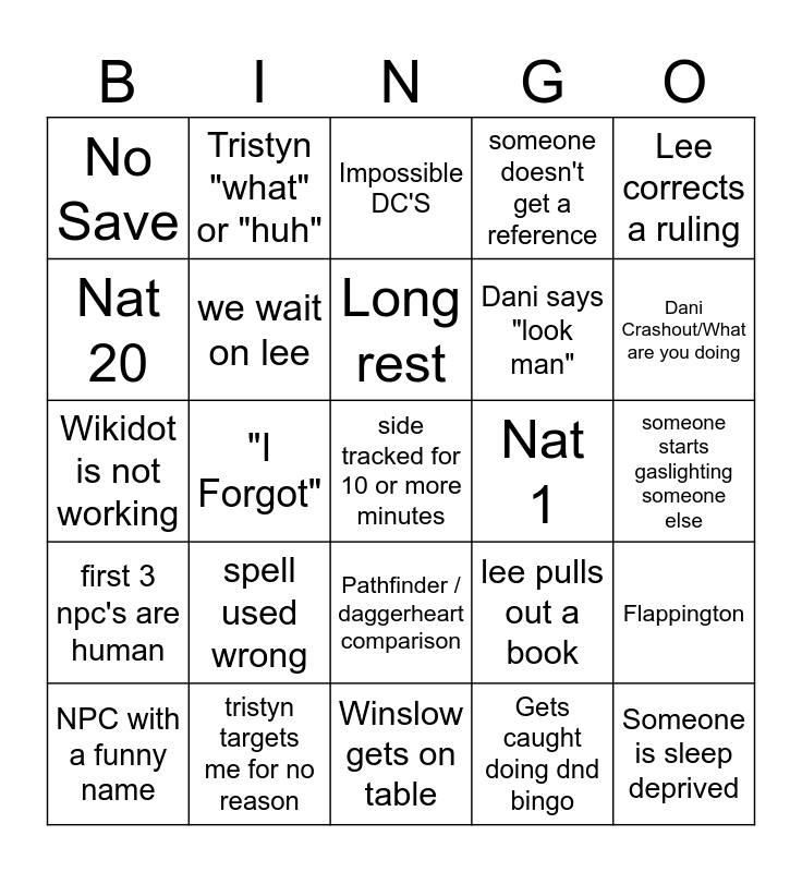 This bingo card has a free space and 24 words: spell used wrong, tristyn targets me for no reason, Long rest, NPC with a funny name, Lee corrects a ruling, No Save, Nat 20, Tristyn "what" or "huh", Nat 1, Pathfinder / daggerheart comparison, Dani says "look man", Wikidot is not working, lee pulls out a book, Flappington, we wait on lee, Gets caught doing dnd bingo, someone starts gaslighting someone else, Impossible DC'S, Dani Crashout/What are you doing, "I Forgot", Someone is sleep deprived, first 3 npc's are human, someone doesn't get a reference and Winslow gets on table.