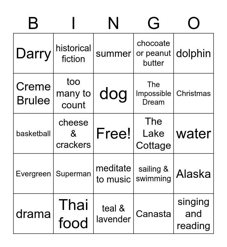 This bingo card has a free space and 24 words: Superman, Thai food, dog, drama, dolphin, Darry, Creme Brulee, historical fiction, The Lake Cottage, meditate to music, The Impossible Dream, basketball, sailing & swimming, Alaska, too many to count, Canasta, water, summer, Christmas, cheese & crackers, singing and reading, Evergreen, chocoate or peanut butter and teal & lavender.