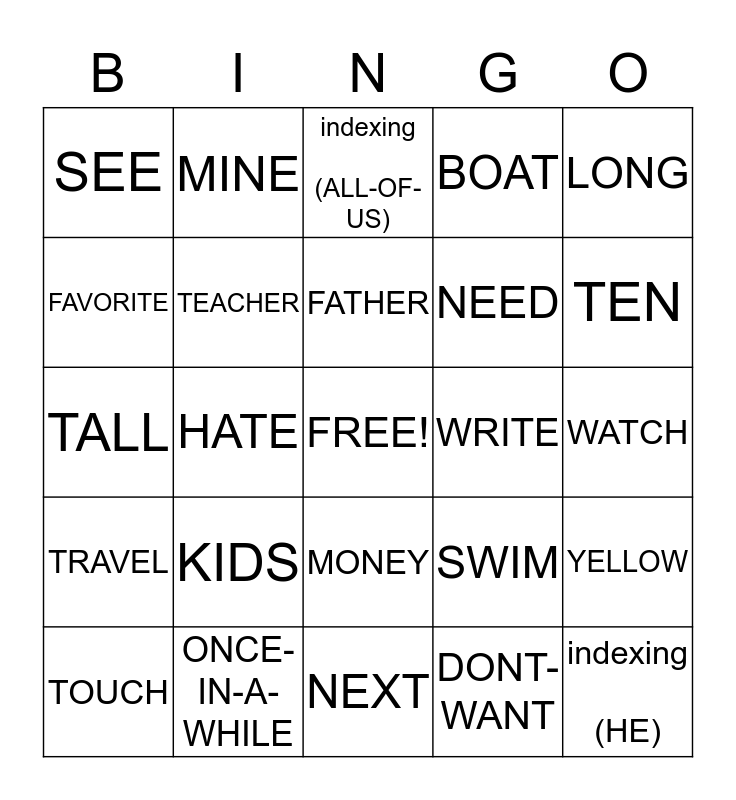 This bingo card has a free space and 24 words: KIDS, ONCE-IN-A-WHILE, FATHER, TOUCH, LONG, SEE, FAVORITE, MINE, WRITE, MONEY, NEED, TALL, SWIM, YELLOW, TEACHER, DONT-WANT, WATCH, indexing (ALL-OF-US), TEN, HATE, indexing (HE), TRAVEL, BOAT and NEXT.