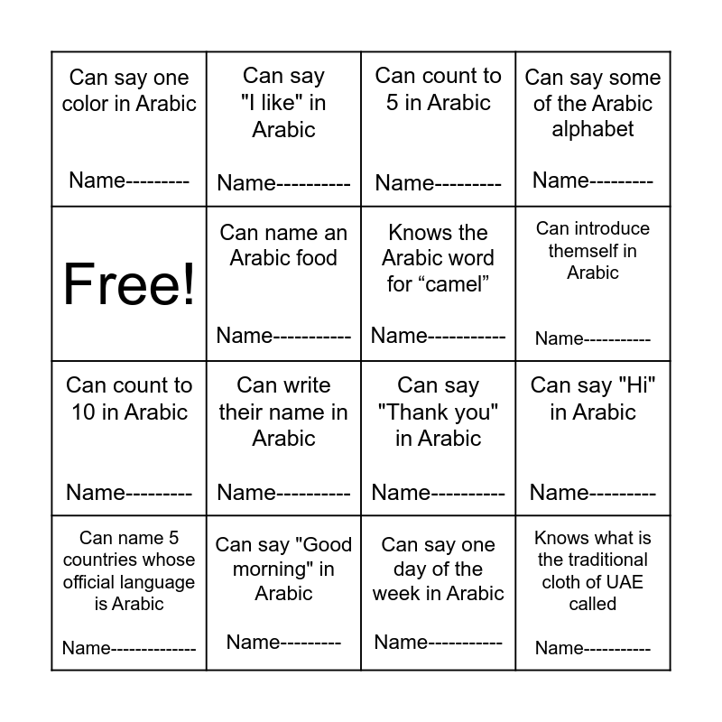 This bingo card has 16 words: Can say "Good morning" in Arabic Name---------, Can say "Hi" in Arabic Name---------, Can count to 5 in Arabic Name---------, Can say one color in Arabic Name---------, Can count to 10 in Arabic Name---------, Can say "I like" in Arabic Name----------, Can say "Thank you" in Arabic Name----------, Can say one day of the week in Arabic Name-----------, Free!, Can name an Arabic food Name-----------, Can name 5 countries whose official language is Arabic Name--------------, Can say some of the Arabic alphabet Name---------, Can write their name in Arabic Name----------, Can introduce themself in Arabic Name-----------, Knows the Arabic word for “camel” Name----------- and Knows what is the traditional cloth of UAE called Name-----------.