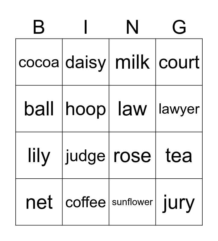 This bingo card has 16 words: coffee, tea, milk, cocoa, lily, daisy, rose, sunflower, ball, hoop, net, court, judge, lawyer, law and jury.