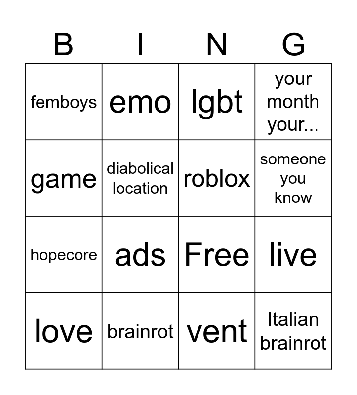 This bingo card has 21 words: brainrot, good night, emo, art, vent, roblox, femboys, lgbt, Free, someone you know, hopecore, your month your..., Italian brainrot, dead meme, diabolical location, nsfw, love, ads, game, live and good music.