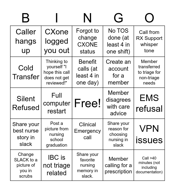 This bingo card has a free space and 29 words: Change SLACK to a picture of you in scrubs, Leg/ Ghost call, Full computer restart, Multiple protocols in one call, Caller hangs up, Forgot to change CXONE status, Thinking to yourself "I hope this call does not get reviewed!", Post a picture from nursing school graduation, Member disagrees with care advice, IBC is not triage related, EMS refusal, Call >40 minutes (not including documentation), Share your favorite nursing memory in slack., Member calling for a prescription, Member transferred to triage for non-triage needs, Talked a member through the IH app for a telemed visit, Clinical Emergency call, Share your best nurse story in slack, Call from RX Support whisper tone, Silent Refused, Share your reason for choosing nursing in slack, Cant find a protocol, Create an account for a member, Cold Transfer, No TOS done (at least 4 in one shift), CXone logged you out, VPN issues, Benefit calls (at least 4 in one day) and Calling for a nurse from another team.