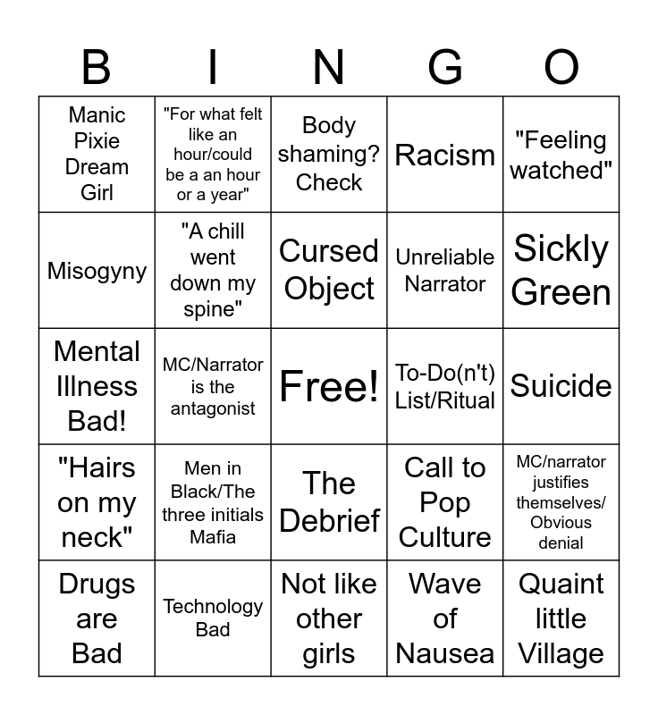 This bingo card has a free space and 32 words: Wave of Nausea, Any variation of 'I will never forget', MC/Narrator is the antagonist, "Sinking feeling", "Hairs on my neck", "A chill went down my spine", "Feeling watched", MC/narrator justifies themselves/ Obvious denial, "For what felt like an hour/could be a an hour or a year", Endless roller coaster uphill, Cursed Object, Body shaming? Check, Open Ending, what happened?, Native Curse/Burial Ground, To-Do(n't) List/Ritual, Lifelong Trauma, Drugs are Bad, Mental Illness Bad!, The Debrief, Men in Black/The three initials Mafia, Call to Pop Culture, Unknown Cause of Death/ Heart attack, Suicide, Technology Bad, Quaint little Village, Racism, Unreliable Narrator, Misogyny, Manic Pixie Dream Girl, Not like other girls, WTF? Just WTAF? and Sickly Green.