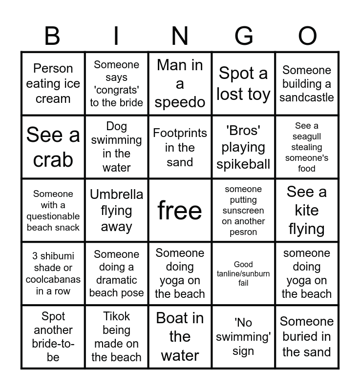 This bingo card has a free space and 27 words: Good tanline/sunburn fail, Someone putting sunscreen on nose, 'Bros' playing spikeball, Boat in the water, See a crab, Man in a speedo, Someone says 'congrats' to the bride, 3 shibumi shade or coolcabanas in a row, someone putting sunscreen on another pesron, someone doing yoga on the beach, Someone with a questionable beach snack, Spot a lost toy, Spot another bride-to-be, Tikok being made on the beach, See a seagull stealing someone's food, Wind blowing someone's hat, Dog swimming in the water, Footprints in the sand, Someone doing a dramatic beach pose, Person eating ice cream, See a kite flying, 'No swimming' sign, Umbrella flying away, Someone buried in the sand, Someone doing yoga on the beach, Someone building a sandcastle and Wind blowing an umbrella.