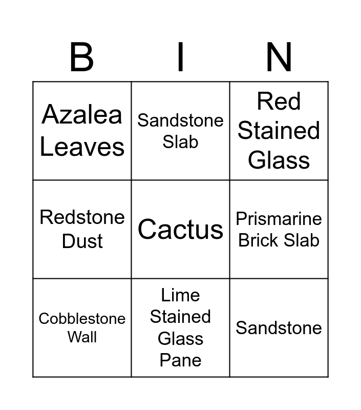 This bingo card has a free space and 8 words: Prismarine Brick Slab, Red Stained Glass, Sandstone Slab, Cobblestone Wall, Azalea Leaves, Sandstone, Redstone Dust and Lime Stained Glass Pane.