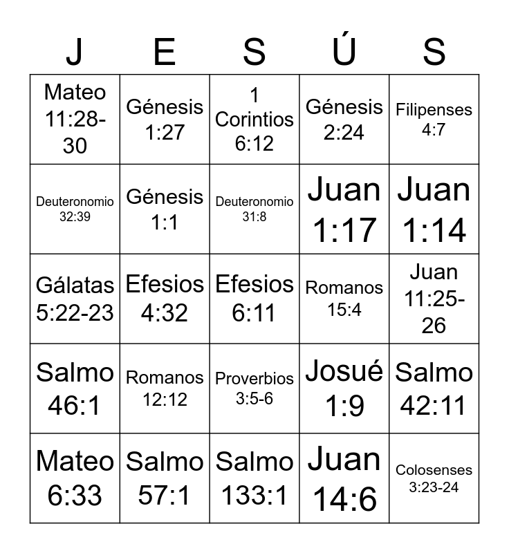 This bingo card has 75 words: 1 Corintios 1:18, 1 Corintios 2:2, 1 Corintios 6:12, 1 Corintios 6:18, 1 Corintios 10:13, 1 Corintios 16:2, 1 Pedro 5:6-7, 2 Corintios 13:11, 2 Timoteo 3:16-17, Colosenses 3:14, Colosenses 3:23-24, Deuteronomio 6:6-7, Deuteronomio 31:8, Deuteronomio 32:39, Efesios 4:2, Efesios 4:32, Efesios 5:15-17, Efesios 6:11, Filipenses 4:6, Filipenses 4:7, Gálatas 3:26-27, Gálatas 5:22-23, Génesis 1:1, Génesis 1:27, Génesis 2:24, Génesis 12:3, Génesis 50:20, Hebreos 11:1, Hebreos 11:6, Hechos 16:31, Isaías 40:30-31, Isaías 41:10, Jeremías 29:11, Josué 1:9, Juan 1:14, Juan 1:17, Juan 3:16, Juan 10:14, Juan 11:25-26, Juan 14:6, Juan 15:5, Juan 16:33, Judas 20-21, Lucas 24:5-6, Marcos 9:23, Marcos 16:15-16, Mateo 6:33, Mateo 11:28-30, Mateo 22:37-39, Mateo 28:19-20, Nahúm 1:7, Proverbios 3:5-6, Proverbios 4:23, Proverbios 11:27, Proverbios 17:17, Proverbios 17:9, Proverbios 22:6, Romanos 6:23, Romanos 8:28, Romanos 10:10, Romanos 12:12, Romanos 12:2, Romanos 13:1-2, Romanos 14:7-8, Romanos 15:13, Romanos 15:4, Salmo 23:1, Salmo 23:4, Salmo 27:1, Salmo 42:11, Salmo 46:1, Salmo 57:1, Salmo 119:105, Salmo 133:1 and Santiago 1:22.
