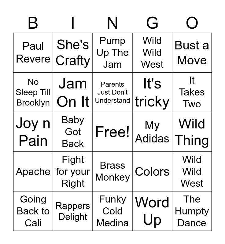 This bingo card has a free space and 25 words: Fight for your Right, Funky Cold Medina, Parents Just Don't Understand, Going Back to Cali, Bust a Move, Paul Revere, No Sleep Till Brooklyn, She's Crafty, My Adidas, Brass Monkey, It's tricky, Joy n Pain, Colors, Wild Wild West, Jam On It, Word Up, Wild Thing, Pump Up The Jam, It Takes Two, Baby Got Back, The Humpty Dance, Rappers Delight, Apache, Wild Wild West and Word Up.